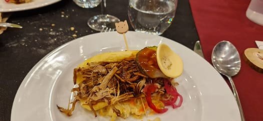 La cena fue un recorrido por distintos platos y sabores de España, y corrió su diseño a cuenta del cocinero Pablo Cabrera, que una vez más hizo que saboreásemos literalmente nuestro país. También la música estuvo presente con Miguel Ángel Gómez González-Vallés y Ángela Ledesma, que con el piano y las castañuelas interpretaron melodías con aroma español, la danza andaluza de Granados.